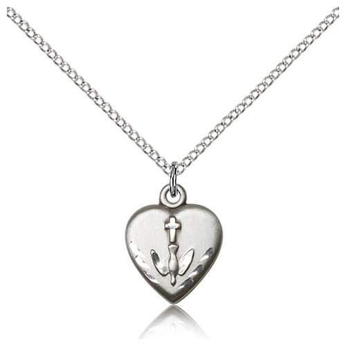 Die struck, hand-engraved confirmation medal is made of sterling silver. Free 18-inch sterling silver lite curb chain with lobster clasp. Dimensions: 5/8in x 1/2in. This heart shaped confirmation medal is slightly smaller than a dime. Made in USA.