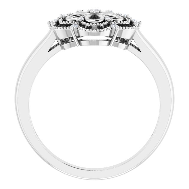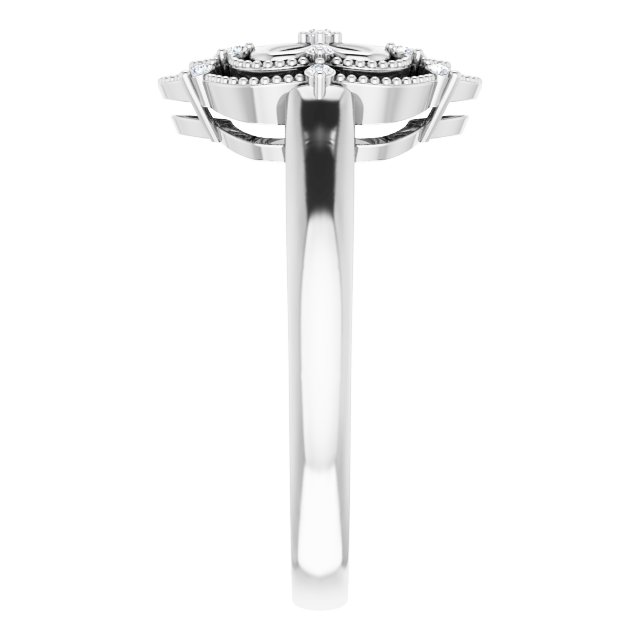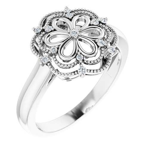 .08 ct tw diamond ring features a floral design and is cast in polished sterling silver. Diamond details: I2 clarity, G-H color 13 round brilliant diamonds. Ring approximate weight: 2.58 grams. Imported. Available in whole finger sizes 5-8 only.