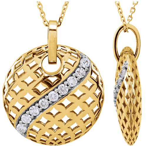 14kt yellow gold round diamond necklace features a swoosh of diamonds. Diamond details: 9 x 2mm round diamonds, G-H color and I1 clarity. 18in diamond cut cable chain with spring ring clasp. Weight: 5.8 grams.
