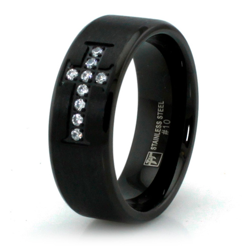 Cross ring is made of black-plated stainless steel. White round cubic zirconia accents form a cross shape. Ring width: 8mm. Available in whole finger sizes 8-12 only. Comfort fit. This item is composed of grade 316L stainless steel, known for its superior corrosion resistance. Nickel free. Imported.