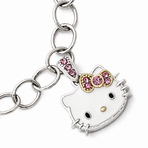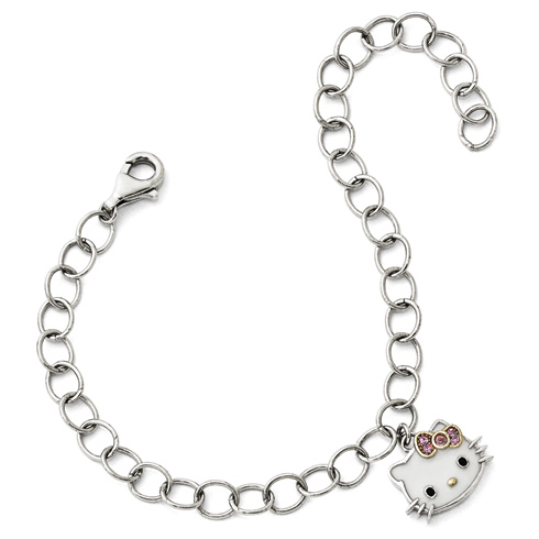 Sterling silver Hello Kitty bracelet features an enameled Hello Kitty with pink crystals. Gold-plated bow. Bracelet length: 7 1/2in. Fancy lobster clasp. Import.