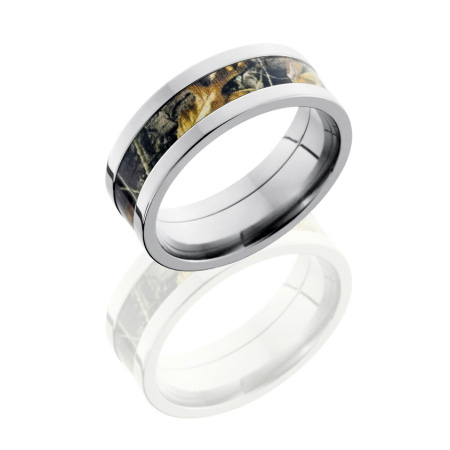 Flat titanium camo ring features Realtree AP inlay. Width: 8mm. Deluxe comfort fit ring is handcrafted in the USA. Please use a narrow ring sizer when sizing your finger. Ring is available in finger sizes 4 to 16, whole and half finger sizes only. This ring is officially licensed by Realtree. Please note, each camo ring is made to order, thus slight variations in camouflage occur. Each ring has its own unique pattern. No two camo rings are identical.