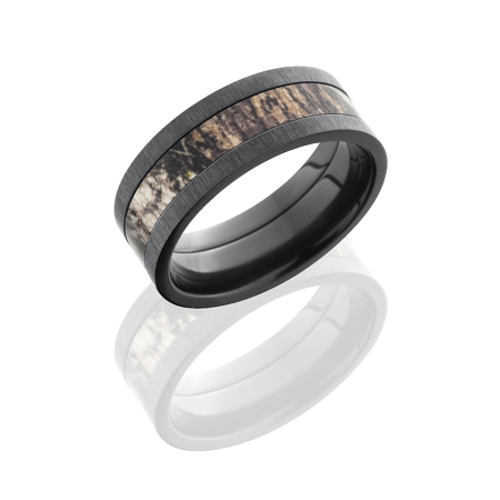 Black zirconium camo ring features Mossy Oak inlay. Flat center and cross satin finish edges. Width: 8mm. Deluxe comfort fit ring is handcrafted in the USA. Please use a narrow ring sizer when sizing your finger. Ring is available in finger sizes 6 to 14, whole and half finger sizes only. This ring is officially licensed by Mossy Oak. Please note, each camo ring is made to order, thus slight variations in camouflage occur. Each ring has its own unique pattern. No two camo rings are identical.