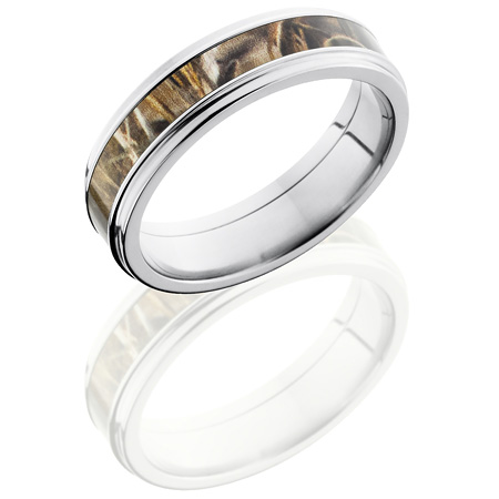 Titanium camo ring features Realtree Max-4 inlay. Width: 6mm. Ring has a flat center and flat grooved edges. Deluxe comfort fit ring is handcrafted in the USA. Please use a narrow ring sizer when sizing your finger. Ring is available in finger sizes 6 to 16. This ring is officially licensed by Realtree. Please note, each camo ring is made to order, thus slight variations in camouflage occur. Each ring has its own unique pattern. No two camo rings are identical.