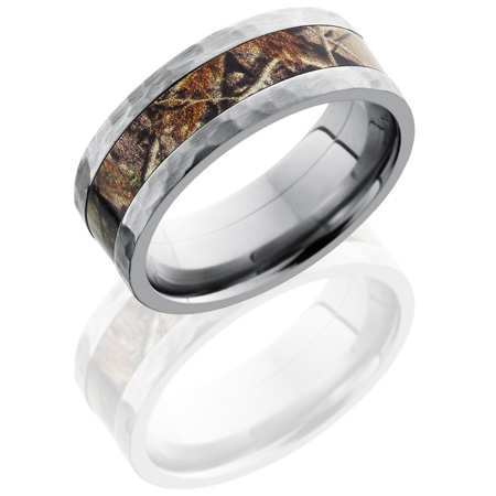 Titanium camo ring features Realtree AP inlay. Width: 8mm. Ring has a flat center and hammered finish edges. Deluxe comfort fit ring is handcrafted in the USA. Please use a narrow ring sizer when sizing your finger. Ring is available in finger sizes 6 to 16. This ring is officially licensed by Realtree. Please note, each camo ring is made to order, thus slight variations in camouflage occur. Each ring has its own unique pattern. No two camo rings are identical.