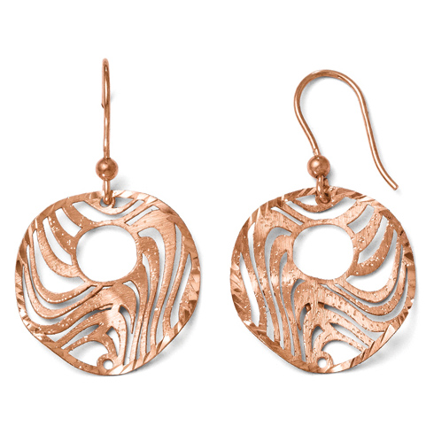 These round laser-cut earrings are composed of polished, rose gold-plated sterling silver. Shepherd hook earrings are made in Italy. Dimensions: 1in x 1in. Approximate item weight: 3.0 grams. Pair with matching necklace FN40.