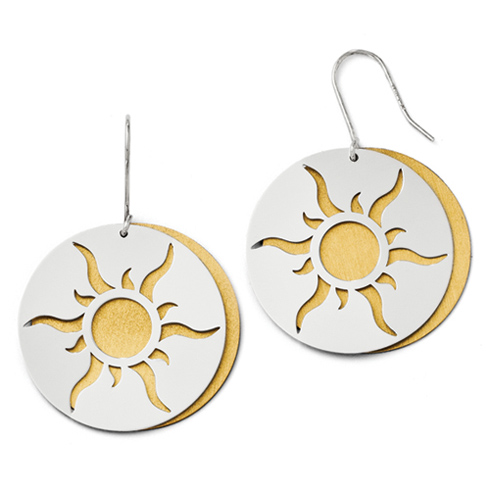 These sun earrings are composed of polished, 14kt yellow gold-plated sterling silver. Shepherd hook earrings are made in Italy. Dimensions: 1 1/8in x 1 1/8in. Approximate item weight: 10.1 grams. Pair with matching necklace QLF108.