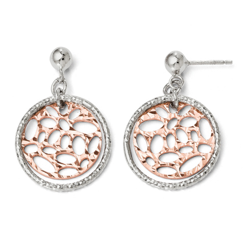 These dangle earrings are made of polished, rose gold-plated sterling silver. Dangle earrings with posts. Made in Italy. Dimensions: 1 1/8in x 3/4in. Approximate item weight: 4.4 grams. Pair with matching necklace L114.