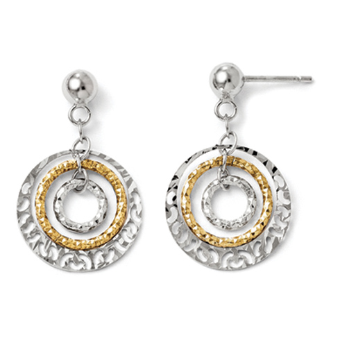 These concentric circle earrings are composed of polished, 14kt yellow gold-plated sterling silver. Dangle earrings are made in Italy. Dimensions: 1in x 5/8in. Approximate item weight: 10.1 grams. Pair with matching necklace L121.