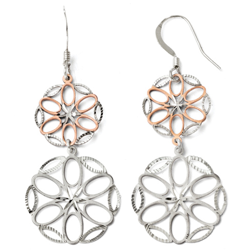 Textured, cut-through petal design dangle earrings are made of polished, rose gold-plated sterling silver. Approximate item weight: 2.4 grams. Made in India.