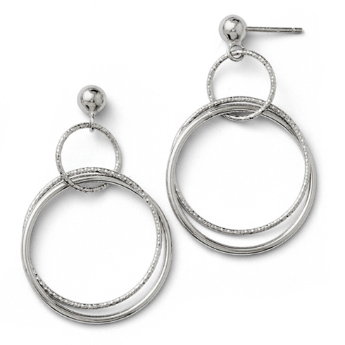 Textured, triple hoop earrings are made of polished, sterling silver. Earring length: 1 5/8in. Widest hoop is 1in across. Post dangle earrings are made in Italy. Approximate item weight: 3.9 grams.