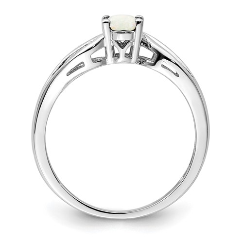 Rhodium plated sterling silver ring features oval created opal and cut out shank. Available in whole finger sizes 5-10 only. Imported. Weight: 1.7 grams.