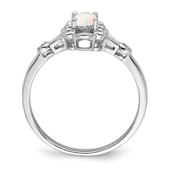 Rhodium plated sterling silver ring features oval created opal and two genuine diamond accents. Available in whole finger sizes 5-10 only. Import. Weight: 1.5 grams.