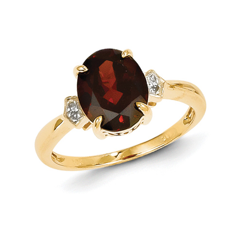 This oval garnet and diamond ring is made of polished, 14kt yellow gold. Gemstone details: one 9mm x 7mm oval faceted, genuine garnet. .02 ct tw diamond accents. Approximate item weight: 2.4 grams. Import.