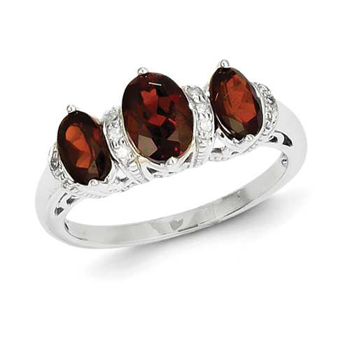 This three stone oval garnet ring is made of polished, 14kt white gold. 1.5 ct tw garnet, .04 ct tw diamond accents. Approximate item weight: 3.2 grams. Import.