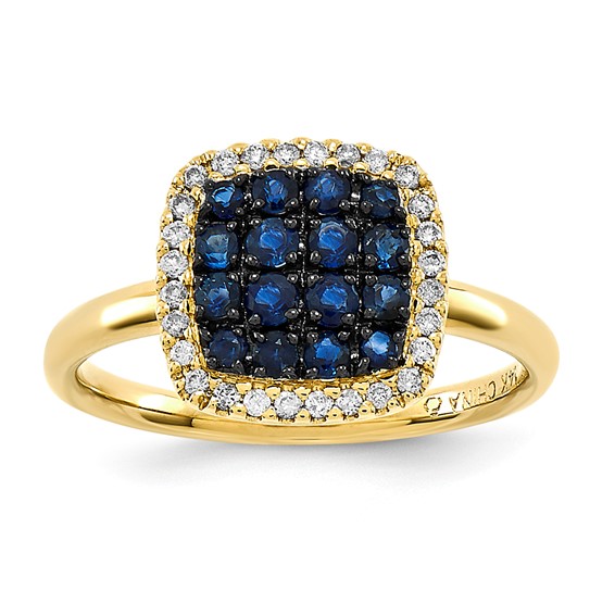 This blue sapphire and diamond ring is made of polished, 14kt yellow gold. Gemstone details: 2/3 ct tw genuine round blue sapphires and 1/8 ct tw diamond accents. Approximate item weight: 2.9 grams. Imported.