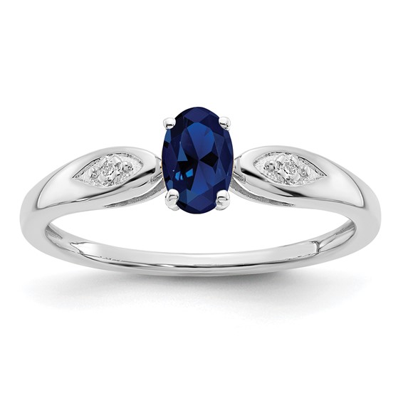 This oval blue sapphire ring with two diamonds is made of polished 14k white gold. Gemstone details: one 2/3 ct tw genuine oval blue sapphire and .01 ct tw diamond accents. Sapphire dimensions: 6mm x 4mm. Approximate item weight: 1.5 grams. Open back. Import.