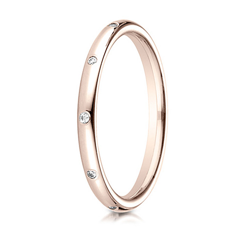 This 14kt rose gold wedding band has ten burnished set diamonds, .10 ct tw. Die struck and comfort fit. Width: 2mm. Thickness: 1.8mm. Diamond quality: G-H color, SI1-SI2 clarity. Made in USA.