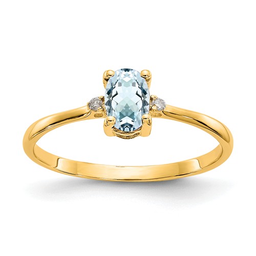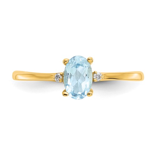 This oval aquamarine and diamond ring is made of polished, 14kt yellow gold. Gemstone details: one 2/5 ct tw genuine oval aquamarine and .01 ct tw diamond accents. Aquamarine dimensions: 6mm x 4mm. Medium color; eye clean; good cut. Approximate item weight: .9 grams. Open back. Import.