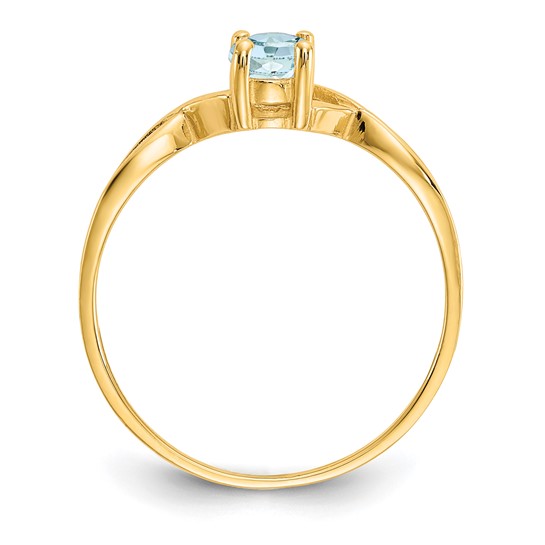 This oval aquamarine ring is made of polished, 14kt yellow gold. Gemstone details: one 2/5 ct tw genuine oval aquamarine. Aquamarine dimensions: 6mm x 4mm. Medium color; eye clean; good cut. Approximate item weight: .9 grams. Open back. Import.