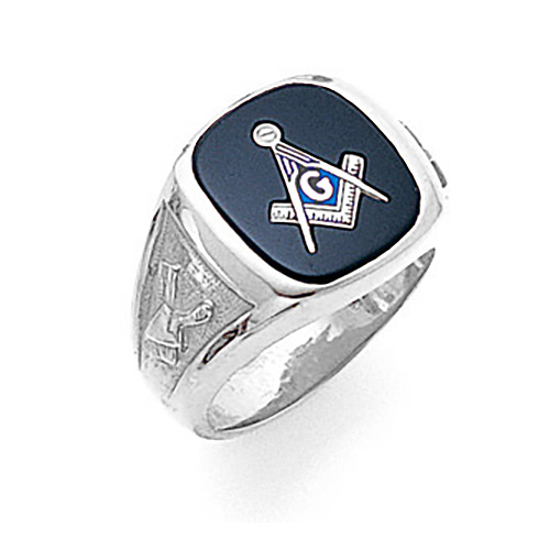 Jumbo 10k white gold masonic ring features your choice of a red, blue or onyx 15x13mm stone. Solid back. Wide shank with trowel and Pythagorean side emblems. Made in USA.