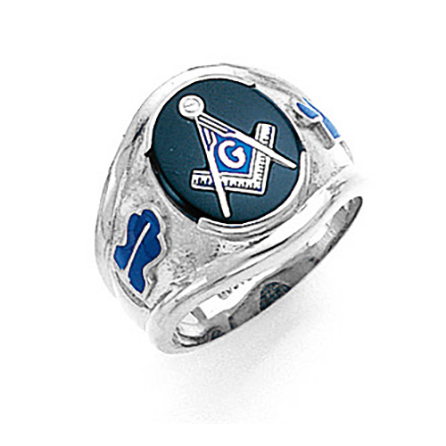Choose open or solid back. Polished 10kt white gold ring with masonic compass and set square symbol. Choose red, blue or onyx oval stone. Choose two blue enamel side emblems. Wide tapered shank. Pictured with plumb bob and trowel side emblems. Approximate weights: open back ring, 11.6 grams; solid back ring: 16.6 grams.