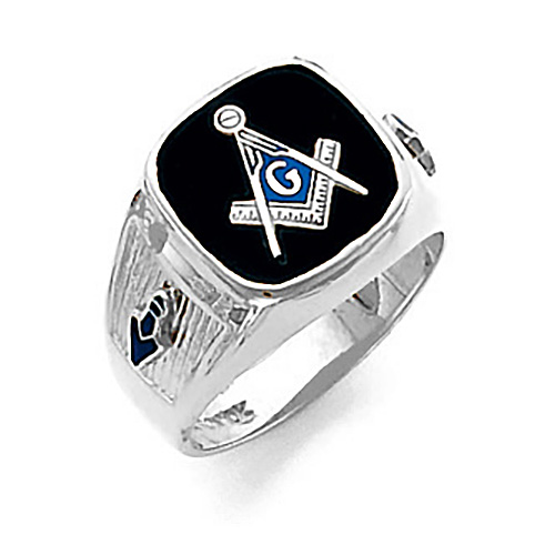Polished 14kt white gold ring with masonic compass and set square symbol. Choose red, blue or onyx oblong stone. Choose two blue enamel side emblems. Wide shank. Pictured with plumb bob and trowel side emblems. Choose open or solid back. A solid back size 10 ring weighs approximately 16.0 grams. Standard fit. Made in USA.