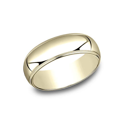 This men's 10k yellow gold wedding band has a milgrain edge and domed center. Width: 7mm, thickness: 1.8mm. Die struck and comfort fit. Polished finish. Made in USA.