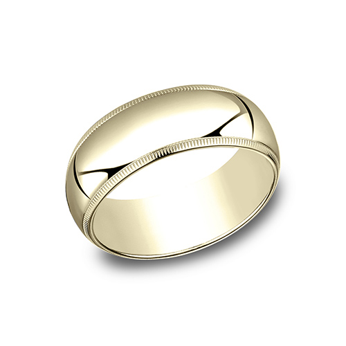 This 10k yellow gold wedding band features milgrain edges and an oval center. Die struck and comfort fit. Width: 8mm, thickness: 1.8mm. Solid 10kt yellow gold. Made in USA.
