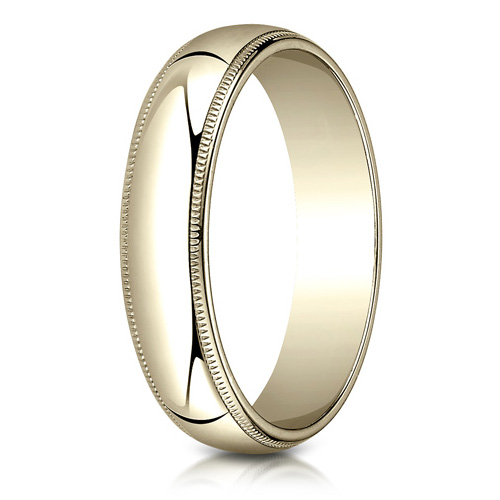 This 10kt yellow gold wedding band features milgrain edges and an oval center. Die struck and comfort fit. Width: 5mm, thickness: 1.8mm. Made in USA.