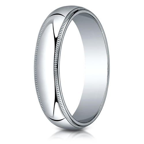 This 10kt white gold wedding band features milgrain edges and an oval center. Die struck and comfort fit. Width: 5mm, thickness: 1.8mm. Made in USA.