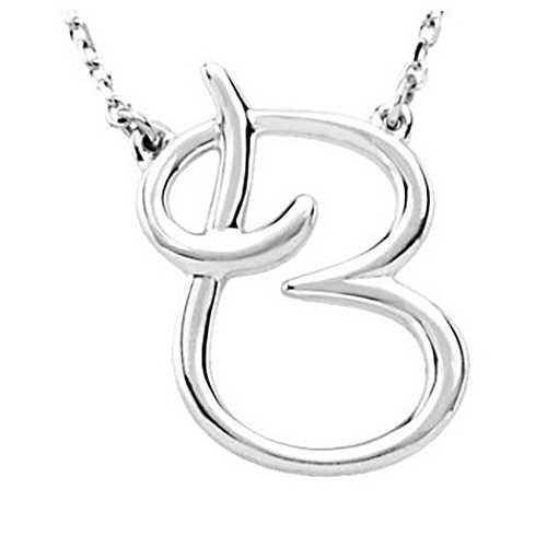 Capital letter B script charm dangles from a 16in diamond cut cable chain. Charm dimensions: 5/8in x 1/2in. Chain width: 1mm. Lobster clasp. Weight: 3.0 grams.