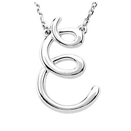 Capital letter E script charm dangles from a 16in diamond cut cable chain. Charm dimensions: 5/8in x 1/2in. Chain width: 1mm. Lobster clasp. Weight: 3.0 grams.