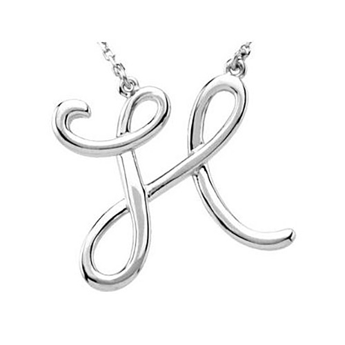 Capital letter H script charm dangles from a 16in diamond cut cable chain. Charm dimensions: 5/8in x 1/2in. Chain width: 1mm. Lobster clasp. Weight: 3.0 grams.