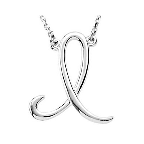 Capital letter I script charm dangles from a 16in diamond cut cable chain. Charm dimensions: 5/8in x 1/2in. Chain width: 1mm. Lobster clasp. Weight: 3.0 grams.