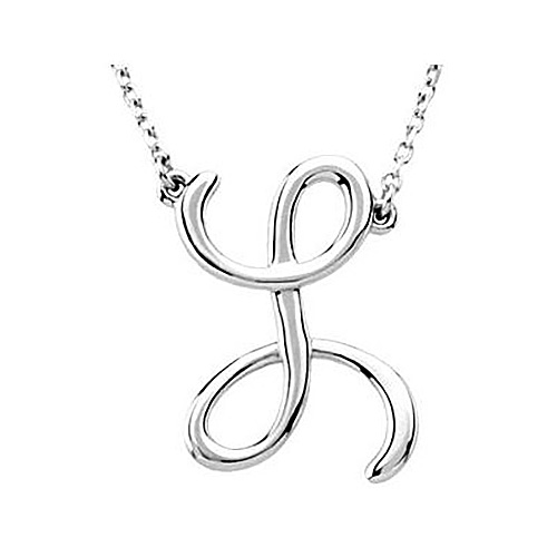 Capital letter L script charm dangles from a 16in diamond cut cable chain. Charm dimensions: 5/8in x 1/2in. Chain width: 1mm. Lobster clasp. Weight: 3.0 grams.