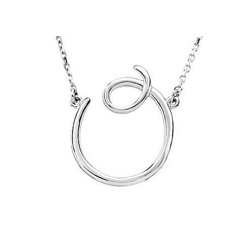 Capital letter O script charm dangles from a 16in diamond cut cable chain. Charm dimensions: 5/8in x 1/2in. Chain width: 1mm. Lobster clasp. Weight: 3.0 grams.