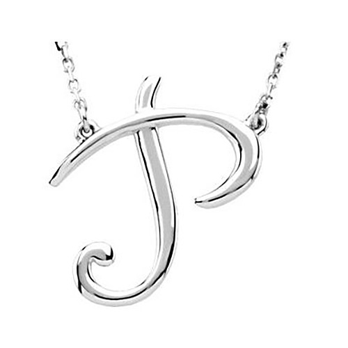 Capital letter P script charm dangles from a 16in diamond cut cable chain. Charm dimensions: 5/8in x 1/2in. Chain width: 1mm. Lobster clasp. Weight: 3.0 grams.