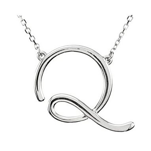 Capital letter Q script charm dangles from a 16in diamond cut cable chain. Charm dimensions: 5/8in x 1/2in. Chain width: 1mm. Lobster clasp. Weight: 3.0 grams.