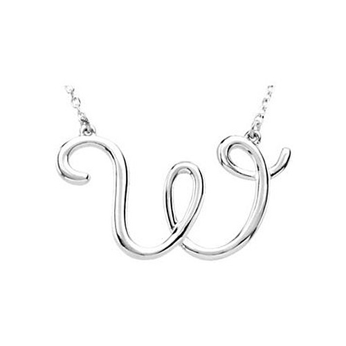 Capital letter W script charm dangles from a 16in diamond cut cable chain. Charm dimensions: 5/8in x 1/2in. Chain width: 1mm. Lobster clasp. Weight: 3.0 grams.