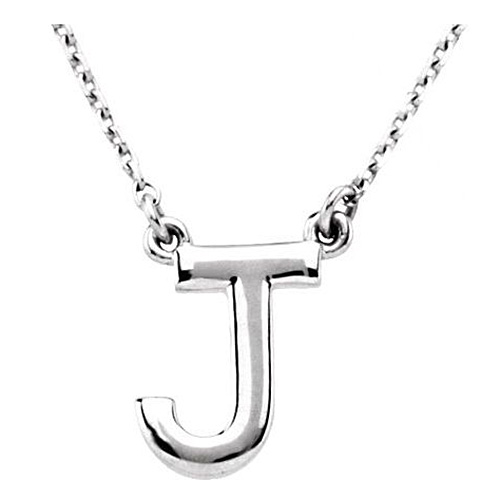 Block letter J charm dangles from a 16in diamond cut cable chain. Charm height: 1/2in. Chain width: 1mm. Lobster clasp. Weight: 3.0 grams.