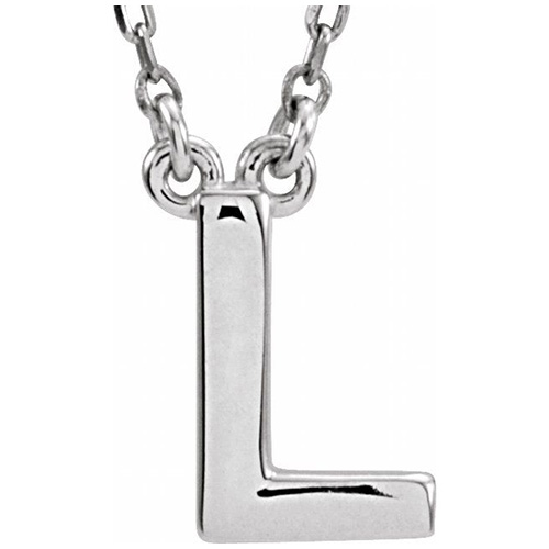 Block letter L charm dangles from a 16in diamond cut cable chain. Charm height: 1/2in. Chain width: 1mm. Lobster clasp. Weight: 3.0 grams.