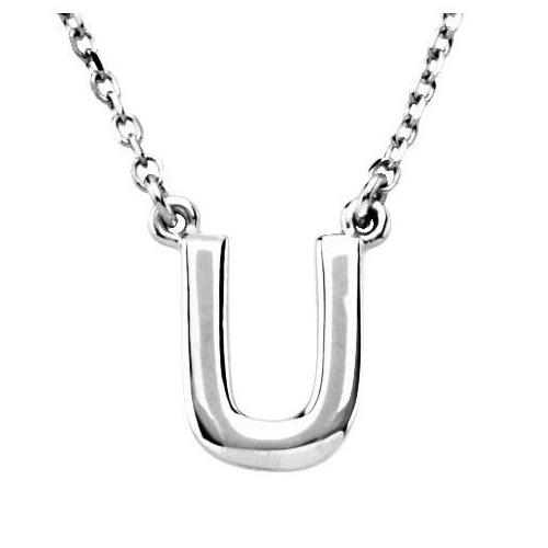 Block letter U charm dangles from a 16in diamond cut cable chain. Charm height: 1/2in. Chain width: 1mm. Lobster clasp. Weight: 3.0 grams.