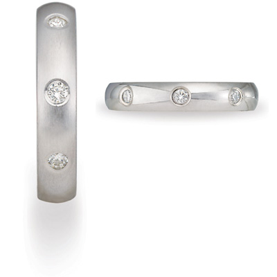 Platinum 4mm wedding band has eight round diamonds at intervals all the way around the ring. Die struck and comfort fit. 8 x .04CT round brilliant diamonds. Diamond color G, clarity SI1. Diamonds are carefully matched and subject to stringent inspection. Precision-set. Polished finish. Solid platinum 950 [95% Platinum, 5% Ruthenium alloy]. Made in USA.Lifetime GuaranteeIf your ring is ever damaged during normal wear, the manufacturer will repair or replace your wedding ring free of charge. If your finger size ever changes, the manufacturer will resize or replace your ring free of charge. In the case that the manufacturer has to add material to your ring, you will only be charged for the difference in the additional metal or stones needed to restore the piece. Guarantee ParametersThe guarantee does not cover rings that have been ordered in the wrong finger size or finger sizes that may have changed between the time of purchase and the actual physical receipt of the piece. Third party alterations, other than engraving, will void the warranty.The manufacturer reserves the right to deny the Lifetime Guarantee for any ring that shows signs of abuse or tampering.