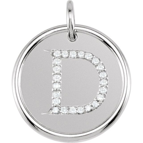 Round sterling silver initial D charm has genuine diamond accents. Charm dimensions: 17.25mm. The charm is set with 1mm, full cut G-H color I1 clarity genuine round diamonds. Weight: 2.6 grams.