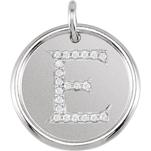 Round sterling silver initial E charm has genuine diamond accents. Charm dimensions: 17.25mm. The charm is set with 1mm, full cut G-H color I1 clarity genuine round diamonds. Weight: 2.6 grams.