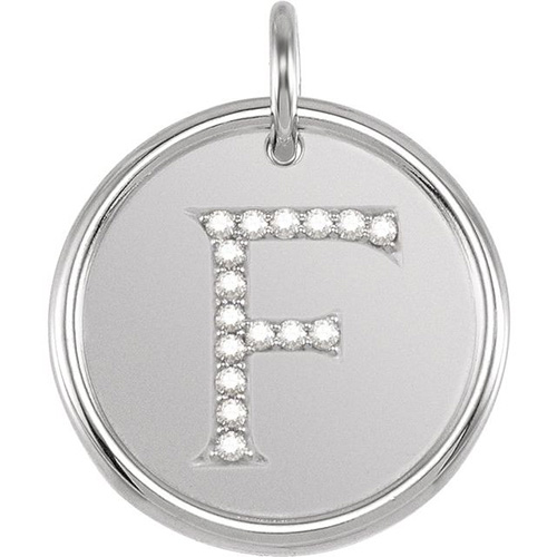 Round sterling silver initial F charm has genuine diamond accents. Charm dimensions: 17.25mm. The charm is set with 1mm, full cut G-H color I1 clarity genuine round diamonds. Weight: 2.6 grams.