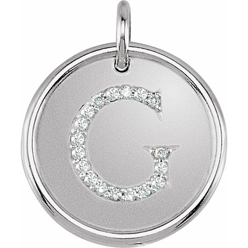 Round sterling silver initial G charm has genuine diamond accents. Charm dimensions: 17.25mm. The charm is set with 1mm, full cut G-H color I1 clarity genuine round diamonds. Weight: 2.6 grams.