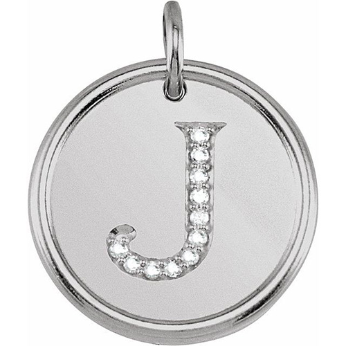 Round sterling silver initial J charm has genuine diamond accents. Charm dimensions: 17.25mm. The charm is set with 1mm, full cut G-H color I1 clarity genuine round diamonds. Weight: 2.6 grams.