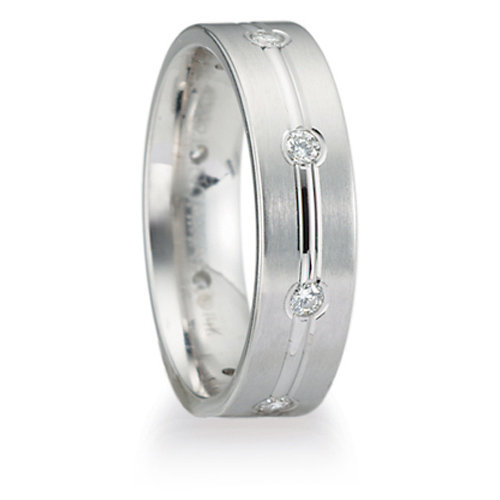 This men's 1/3 carat diamond platinum wedding band has a polished center groove and satin edges. Ring width: 6mm. 8 x .04CT round brilliant diamonds. Diamond color G, clarity SI1. Diamonds are carefully matched and subject to stringent inspection. Precision-set. Solid platinum 950 [95% Platinum, 5% Ruthenium alloy] Die struck and comfort fit. Made in USA.
